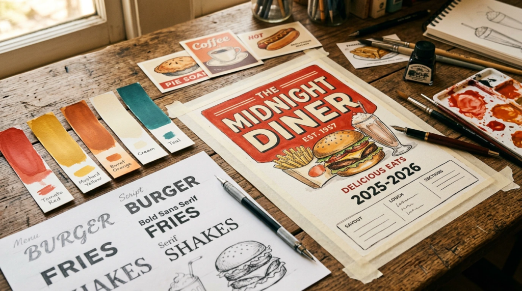 식욕을 자극하는 비주얼부터 시선을 사로잡는 레이아웃, 그리고 2026년 최신 레트로 타이포그래피 트렌드까지. 손님을 매장으로 이끄는 완벽한 음식점 포스터 제작 가이드를 공개합니다.